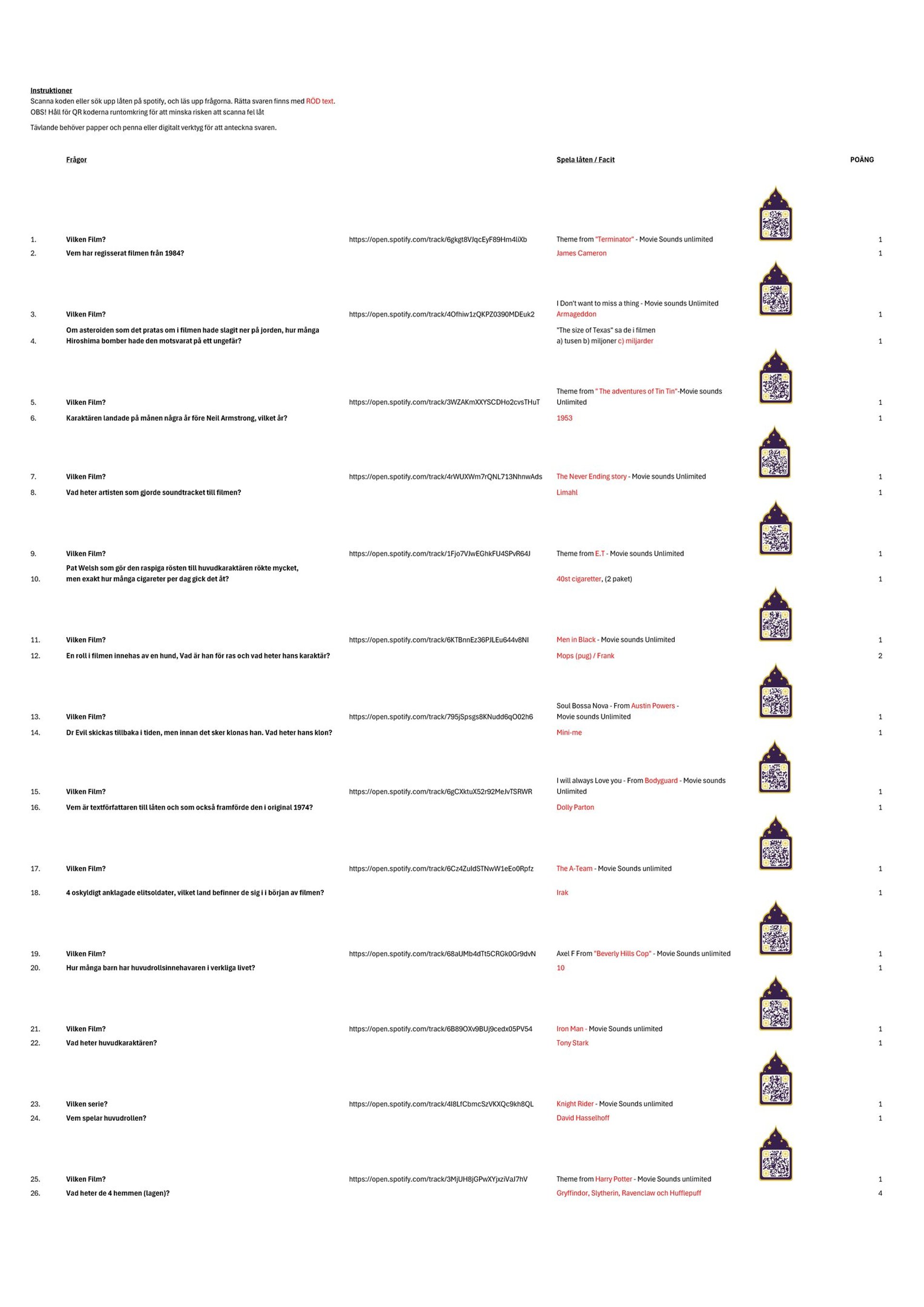 Tyvärr fungerar inte länkarna direkt från hemsidan, använd QR koder eller sök upp låten manuellt. Vill du amvända länkar kan du ladda ner en